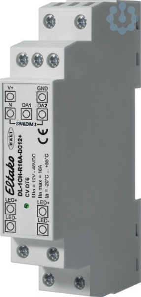 1-Kanal DALI-LED-Dimmer für Tragschiene DIN-EN 60715 TH35. 98x17,5x56mm. Schutzart IP20. Stand-by-Verlust nur 0,12 Watt. Geeignet zum Ansteuern von Konstantspannungs-LED-Modulen (CV) mit Betriebsspannungen von 12V bis 48V. Sw&Dim oder SwitchDim2: Betrieb über 1 oder 2 Tastereingänge ermöglicht die Steuerung der Helligkeit ohne DALI, alternativ Korridorfunktion zur direkten Ansteuerung mit einem Bewegungsmelder. Dimmbereich 0.1%-100%. PWM-Frequenz umschaltbar (122Hz/244Hz/488Hz/976Hz). Versorgungsspannung 12V bis 48V DC. Max. Anschlussstrom 16A. Hoher Wirkungsgrad. Konfiguration über PC-Software DALI-Cockpit und DALI-USB Interface. Betriebsarten: Der Ausgangskanal wird über eine DALI-Adresse (Device Type 6) gesteuert. Die Bedienung kann alternativ auch über einen (Sw&Dim) oder zwei Tastereingänge (SwitchDim2) erfolgen: SwD1,Sw&Dim: Helligkeit. Kurzer Tastendruck: Ein/Aus. Langer Tastendruck: Dimmen. SwD2: Szenenschalter (kurzer Tastendruck). Wird der SwD1-Eingang 2 Minuten lang betätigt, wird auf den Modus Kor