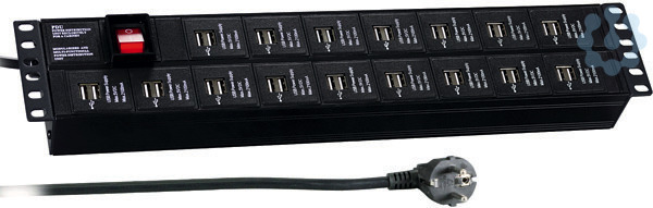 2HE Steckdosenleiste 32 x USB A mit Schalter schwarz, Zuleitung 3 m, je 2,1 A pro 2 Ports