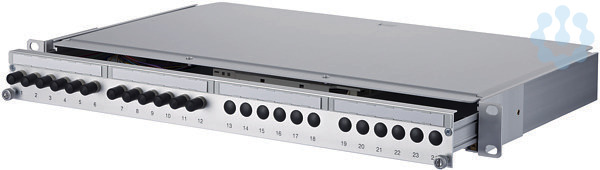 19 Zoll, 1HE LWL-Patchfeld mit ausziehbarer Spleißablage/Frontblende, bestückt mit ST Kupplungen, vorbereitet für den Einbau von vorkonfektionierten Installationskabeln (OpDAT VIK), leichte Aluminium-Konstruktion, nicht belegte Ausbrüche mit Blindstopfen verschlossen, Auszug zur besseren Montage abkipp- und komplett herausnehmbar (Auszugsstopp), variable Kabeleinführung (gerade/schräg) beidseitig möglich, Kabelabfangung mittels mitgeliefertem Kabelbinder oder optionaler Kabelverschraubung möglich, Kabeldurchmesser 3 bis 20 mm, Zugentlastung für Zentralelement/Kevlar, Kabelmanagement durch frei positionierbare Führungselemente, schraubenlose Abdeckung, Sichtfenster für beiliegende Beschriftungseinlagen, Varianten: bestückt mit 12 oder 24 ST Kupplungen jeweils metallisch (SM+MM)