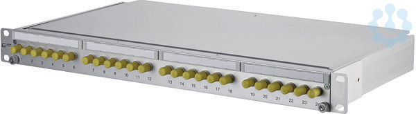19 Zoll, 1HE LWL-Patchfeld mit ausziehbarer Spleißablage/Frontblende, bestückt mit ST Kupplungen, vorbereitet für den Einbau von vorkonfektionierten Installationskabeln (OpDAT VIK), leichte Aluminium-Konstruktion, nicht belegte Ausbrüche mit Blindstopfen verschlossen, Auszug zur besseren Montage abkipp- und komplett herausnehmbar (Auszugsstopp), variable Kabeleinführung (gerade/schräg) beidseitig möglich, Kabelabfangung mittels mitgeliefertem Kabelbinder oder optionaler Kabelverschraubung möglich, Kabeldurchmesser 3 bis 20 mm, Zugentlastung für Zentralelement/Kevlar, Kabelmanagement durch frei positionierbare Führungselemente, schraubenlose Abdeckung, Sichtfenster für beiliegende Beschriftungseinlagen, Varianten: bestückt mit 12 oder 24 ST Kupplungen jeweils metallisch (SM+MM)