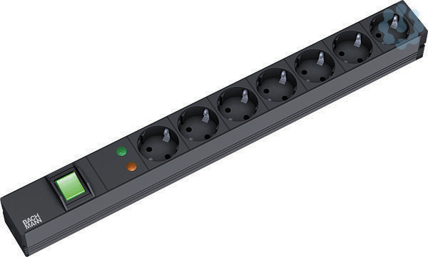 19° - Steckdosenleiste ALU 1HE 7-fach Schutzkontaktsteckdose schwarz mit Schalter grün und Überspannungsschutz 6,5kA (ÜSS) Profil: ALU 1HE schwarz, Länge:438,5mm. Endstücke genietet, nicht öffenbar. 2,0m H05VV-F 3G1,50mm² schwarz mit Schutzkontaktwinkelstecker. inkl. Befestigungswinkel mit Schrauben. verpackt im Polybeutel.