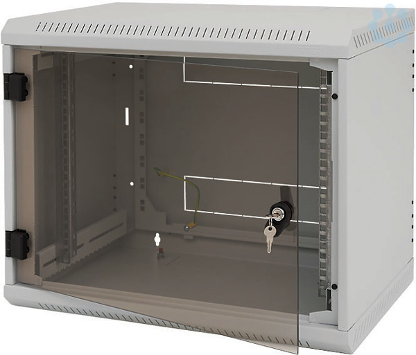 19? vertikale Montageschienen, verzinkt, verstellbar. Je eine Kabeleintrittsöffnung oben und unten, mit abnehmbaren Abdeckungen. Perforation seitlich in Boden und Decke zur Entlüftung.