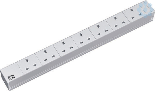 19° Steckdosenleiste ALU 1HE VM 7x UK 90° RAL 7035 2,0m H05VV-F 3G1,5mm² schwarz mit UK Stecker inkl. Befestigungswinkel mit Schrauben. im Polybeutel. mit Bachmann Logo