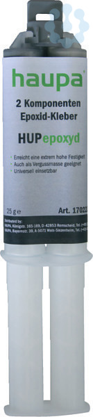 2 Komponenten-Epoxidkleber HUPepoxydAnwendung HUPexpoxyd: Verkleben von Metall, (Hart-) Kunststoff, Keramik, Glas, Porzellan, Stein, Holz, Beton, Gummi u. v. m. Ideal für optisch anspruchsvolle Verklebungen. Klebefläche reinigen, Verschluss öffnen und Mischdüse aufschrauben. Die ersten 2 g entsorgen, da diese noch nicht 1:1 gemischt sind. Danach den Klebstoff auftragen und Teile zusammenfügen. Mischdüse entfernen und entsorgen. Verschluss aufsetzen. Angebrochene Kartuschen kühl lagern und möglichst schnell verarbeiten (kann auch ohne Mischdüse verarbeitet werden). Eigenschaften: Temperaturbeständigkeit: -40°C bis +80°C Verarbeitungstemperatur: +10°C bis +30°C Endaushärtung: 24 Stunden, Topfzeit: ca. 5 Minuten.? Erreicht eine extrem hohe Festigkeit ? Auch als Vergussmasse geeignet ? Universell einsetzbar