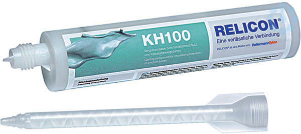Handelsübliche Kartusche mit Mischrohr, Verarbeitung mit gewöhnlicher Kartuschenpistole. Exzellentes Fließverhalten. Elastisch, vibrationsdämpfend, wiederentfernbar. Verbindungen können direkt überprüft werden, der Stichkanal schließt sich wieder. Hervorragende Isoliereigenschaften. Aushärtung ohne Wärmeentwicklung. Salzwasserbeständig. Kennzeichnungsfrei, silikon-, halogen- und isocyanatfrei . SVHC-frei, enthält keine gefährlichen Substanzen, ausgehärtete Produktreste können im Hausmüll entsorgt werden . Lagerzeit: 18 Monate. Die angebrochene Kartusche innerhalb von 24 Stunden verbrauchen. RELICON KH 100 ist ein transparentes, wiederentfernbares, salzwasserbeständiges 2-Komponenten Gel auf Basis von Kohlenwasserstoffharzen. Es eignet sich sehr gut für Kabelabzweigkästen im Niederspannungsbereich, welche sich in feuchter Umgebung oder im Erdreich befinden. Ausgehärtet ist das KH 100 ausgezeichnet widerstandsfähig gegen Feuchtigkeit, besitzt hervorragende Isoliereigenschaften sowie gute Medienbeständigkeit. An
