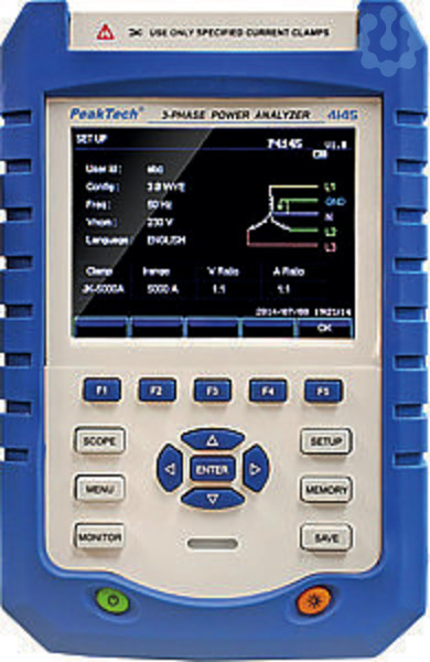 Dieser professionelle 3-Phasen Leistungsanalysator bietet alle wichtigen Funktionen zur Leistungsanalyse in elektrischen 1-Phasen und 3-Phasen Systemen. Die detaillierte Darstellung von den verschiedenen Strömen, Spannungen und Frequenzen, Oberschwingungen, Schein-, Blind-, und Wirkleistungen, sowie die verfügbaren Menüpunkte wie z.B. Wellenformanzeige, Balkendiagramm, Trend-Anzeige, Ereignisliste und Vektorgrafik, ermöglichen umfangreiche Analysefunktionen für Ingenieure und Techniker im Industrie- und Service-Bereich. -14 cm (5,6 ) TFT-Farbdisplay-1-Phasen (2-Draht) und 3-Phasen (3- und 4-Draht) Messung -Messungen von Spannungen, Strömen, Oberschwingungen, Leistungen, Anlaufströmen u. v. a.-Grafische Darstellung der Wellenformen und Vektorgrafik-Interner Datenlogger zur Aufnahme von Ereignissen-LAN und USB-Anschluss
