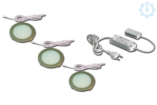 LED-Einbaustrahler mit Flächenlicht als 3er Set, Gehäuse Kunststoff, Anschlussleitung 2,5m mit LED 24-Stecker, incl. steckerfertigem 15W Trafo, Lichtfarbe warm weiß ca. 3000K, schnelle und einfache Montage durch Rasthaken, optionales Zubehör: Dimm-Controller mit Funkfernbedienung, DALI oder 1-10V Dimmer, Montagefeder zum Aufschrauben für den sicheren Halt in Leichtbaudecken, Aufbauring für die Montage ohne Einbaubohrung