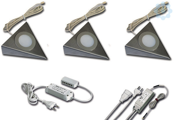 LED-Unterbauleuchte mit homogenem Flächenlicht als 3er Set, Gehäuse edelstahl, Anschlussleitung 2,5m mit LED 24-Stecker, Lichtfarbe warm weiß ca.3000K, incl. steckerfertigem 15W Trafo, ein Leuchten-Gehäuse wird mit dem beiliegenden Touch-Schalter verbunden