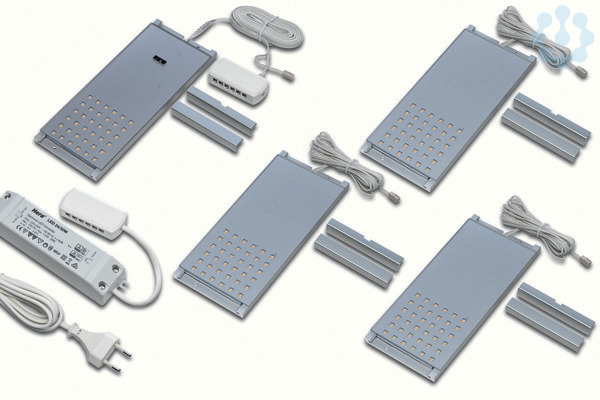 Quadratische, flache LED-Unterbauleuchte als 4er Set, Gehäuse Alu, Anschlussleitung 2,5m mit LED 24-Stecker, incl. steckerfertigem 30W Trafo, Lichtfarbe neutral weiß ca.4000K, incl. berührungsloser IR-Schalter mit NightLight Funktion (zusätzliche kleine LED zur Orientierung im Raum am IR-Schalter)