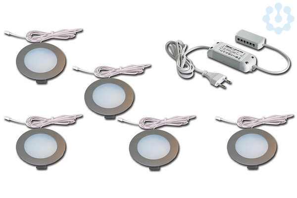LED-Einbaustrahler mit Flächenlicht als 5er Set, Gehäuse Kunststoff, Anschlussleitung 2,5m mit LED 24-Stecker, incl. steckerfertigem 30W Trafo, Lichtfarbe neutral weiß ca. 4000K, schnelle und einfache Montage durch Rasthaken, optionales Zubehör: Dimm-Controller mit Funkfernbedienung, DALI oder 1-10V Dimmer, Montagefeder zum Aufschrauben für den sicheren Halt in Leichtbaudecken, Aufbauring für die Montage ohne Einbaubohrung