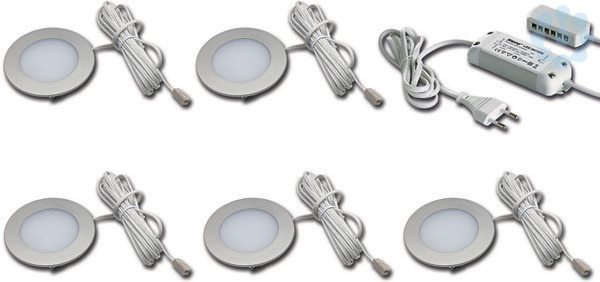 LED-Einbaustrahler mit Flächenlicht als 5er Set, Gehäuse Kunststoff, Anschlussleitung 2,5m mit LED 24-Stecker, incl. steckerfertigem 30W Trafo, Lichtfarbe warm weiß ca. 3000K, schnelle und einfache Montage durch Rasthaken, optionales Zubehör: Dimm-Controller mit Funkfernbedienung, WiFi App, DALI oder 1-10V Dimmer, Aufbauring für die Montage ohne Einbaubohrung