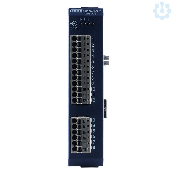 Das Analog-Eingangsmodul 8-Kanal hat acht Analogeingänge für Widerstandsthermometer in Zweileiterschaltung, sowie einen Digitaleingang (DC 0/24 V). Die Analogeingänge besitzen zueinander keine galvanische Trennung. Die digitalisierten Eingangswerte/-zustände stehen im System zur Weiterverarbeitung zur Verfügung. Das Anliegen der Spannungsversorgung, die Betriebszustände des Moduls sowie der Zustand des Digitaleingangs werden durch Leuchtdioden angezeigt. Durch ein optionales Setup-Programm wird das Analog-Eingangsmodul vom Anwender komfortabel konfiguriert. Der Moduleinschub lässt sich im Servicefall einfach nach vorne aus dem Gehäuse ziehen. Das Gehäuse einschließlich Busplatine bleibt dabei auf der Hutschiene montiert.Die Spannungsversorgung beträgt Spannungsversorgung DC 24 V +25/-20 %.