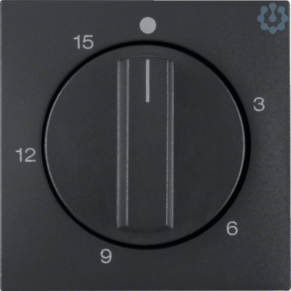 Z.-Stk. mit Regulierknopf für mechanische Zeitschaltuhr B.3/B.7 anthrazit, matt. Zentralstück mit Regulierknopf für mechanische Zeitschaltuhr, mit Aufdruck, Laufzeit 15 Minuten. Unterputz-Installation, Flächen-/Designprogramm. Material: Kunststoff, Thermoplast, bruchsicher, halogenfrei.