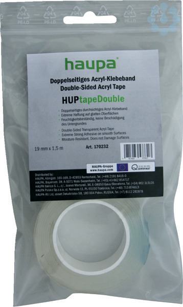 Doppelseitiges Acryl-Klebeband HUPtapeDoubleAnwendung HUPtapeDouble: Hält dauerhaft und sicher auf fast allen glatten Oberflächen wie Metall, Holz, Glas, Kunststoff, Keramik und Gummi. Ideal zur Montage von Halterungen, Schildern, Haken, Ablageelementen, etc. Nicht geeignet für: PE, PP, PTFE (z.B. Teflon®), Silikon, Papier und Vinyl-Tapeten, nicht tragfähigen Untergründen sowie auf Oberflächen mit schmutzabweisenden Beschichtungen. Eigenschaften: HUPtapeDouble ist ein extrem starkes, doppelseitiges Klebeband. Zum beständigen Verkleben, Montieren und Befestigen im Außen- und Innenbereich. bis zu max. 1,3 kg belastbar. Transparent. Die Oberflächen werden nicht beschädigt. Feuchtigkeitsbeständig. In trockenen, sauberen und gut gelüfteten Bereichen bei +10°C bis +30°C 1 Jahr haltbar. Temperaturbeständigkeit -30°C bis 180°C.? Doppelseitiges durchsichtiges Acryl-Klebeband ? Extreme Haftung auf glatten Oberflächen ? Feuchtigkeitbeständig, keine Beschädigung des Untergrundes