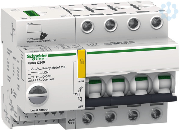 Fernschaltbarer Leitungsschutzschalter Acti 9 Reflex iC60N, Ausschaltvermögen 20kA bei 220-240V AC (EN/IEC 60947-2), 10kA bei 380-415V AC (EN/IEC 60947-2). 4-polig, Nennstrom 25A, C-Charakteristik, Ti24-Schnittstelle, Isolationsspannung (Ui) 500V. Fernschaltung mittels Impuls und/oder Dauersignal entsprechend einem der drei einstellbaren Betriebsarten durch den Anwender. Schützen von Stromkreisen gegen Kurzschlussströme. Schützen von Stromkreisen gegen Überlastströme. Trennen von Stromkreisen. Mit Ti24 Anschluss für die direkte Anbindung an SPS oder dezentrale E/A. Bistabiler Schaltmechanismus benötigt keine Halteleistung. Grüne Anzeige am Schalter garantiert, dass die Kontakte geöffnet sind und ein sicheres Arbeiten auf der Abgangsseite gewährleistet wird. Sprungschaltung garantiert verschleißarmes Schalten der Kontakte. Anzeigeleuchte des Betriebszustandes. Steuerung durch drei einstellbare Betriebsarten anhand des Drucktasters auf der Gerätefrontseite möglich. Schutzart IP20. Zur Steuerung der Eingänge Y1