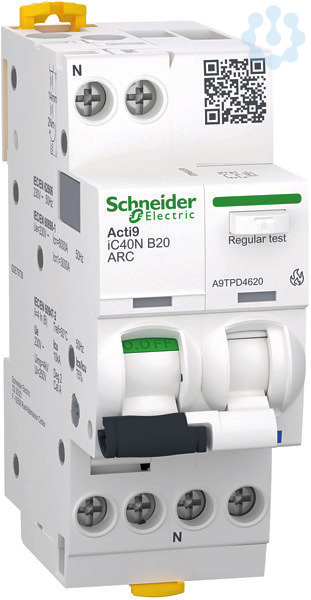 Acti9 iC40N ARC - ist ein AFDD (Fehlerlichtbogenschutzeinrichtung/Brandschutzschalter) zur Erkennung von Fehlerlichtbögen in Kombination mit einem Leitungsschutzschalter. 1P+N, 20A Nennstrom und B-Charakteristik. Das Bemessungskurzschlussausschaltvermögen reicht bis zu 6000A bei 230VAC gemäß EN/IEC 60898-1 und 10kA bei 230VAC gemäß EN/IEC 60947-2. Dieser AFDD in Kombination mit dem Leitungsschutzschalter schützt Stromkreise gegen Kurzschluss, Überlaststrom und Brandgefahr durch Fehlerlichtbögen. Durch die intergierte Sprungschaltung (schalten durch Federkraft) des Schaltmechanismus erhöht sich die Lebensdauer. Die beiden einzigartigen VisiTrip-Anzeigen des Acti9 iArc reduzieren die Interventionszeit, indem sie den ausgefallen Stromkreis anzeigen und die Art des Fehlers schnell identifizieren lassen. Die elektrische Lebensdauer beträgt bis zu 10.000 und die mechanische Lebensdauer bis zu 20.000 Schaltspielen. Die Bemessungsisolationsspannung Ui beträgt 250VAC. Begrenzungsklasse 3 (nach EN/IEC60898-1). Das Prod