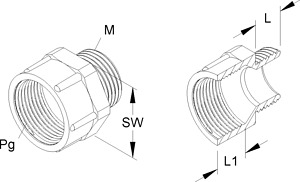 Adapter mit metrischem Anschlussgewinde nach DIN EN 60423 und Pg-Innengewinde nach DIN 40430, glasfaserverstärkt, halogenfrei. Außengewinde : M 12 Innengewinde : Pg 09 Gewindelänge außen : 11 mm Gewindelänge innen : 8,5 mm Schlüsselweite : 19 mit Anschlussgewinde-Dichtring 987M...(bitte gesondert bestellen!) : IP68 Einsatztemperaturbereich : -30° bis 100°C Werkstoff : Polyamid Farbton : lichtgrau RAL : 7035 (ähnlich)