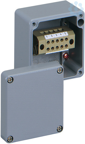 Reihenklemmengehäuse in kompakter Bauform, Industrie Qualität Aluminium, pulverlackbeschichtet, silbergrau RAL 7001, bestückt mit 5-poliger Blockklemme 0,2-4qmm (Schraubanschluss)