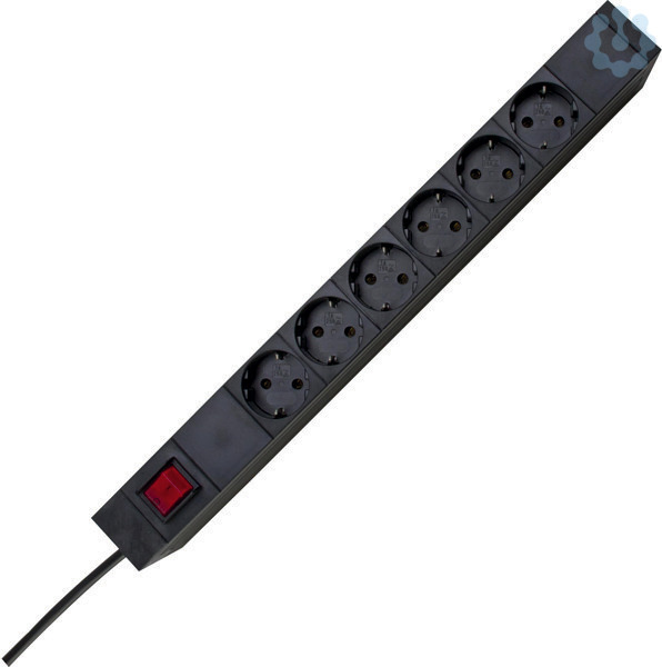 PROFIversal PA, 6+6-fach, mit 2-poligem beleuchtetenSchalter, je 6 Steckplätze front- und rückseitig, mit 45°gedrehten Töpfen, 44,45mm Topfabstand, universelleBefestigungsmöglichkeit, wiederanschließbar, ZuleitungH05VV-F3G1,5mm², 2m, mit Schutzkontakt-Winkelstecker,250VAC, 16A, Länge 482,6mm, VDE, CEE7/III, schwarz