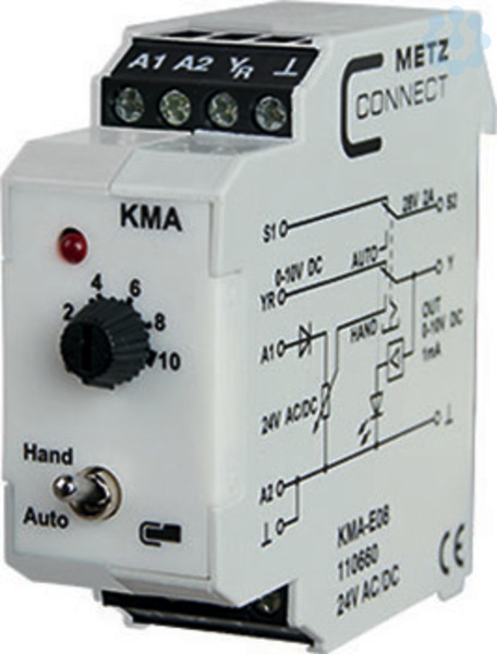 Der Analogwertgeber dient als Stellgrößengeber für manuelle Stellgrößenvorgabe, z. B. Mischklappen, Ventilstellungen, Temperaturwerte usw. Das Modul kann durch zwei Betriebsarten gesteuert werden, welche mittels integriertem zweistufigen Schalter (HAND, AUTO) umschaltbar sind. Über die externen Steuerkontaktklemmen S1 und S2 wird die Schalterstellung rückgemeldet. Schalterstellung HAND: Die Stellgröße kann mittels frontseitigen Potentiometers eingestellt werden. Das Ausgangssignal 0 ... 10 V steht an der Klemme Y zur Verfügung. Schalterstellung AUTO: Die Stellgröße wird ohne Veränderung über die Klemme YR an den Stellgrößenausgang Y durchgeschaltet., Sollwertgeber, Handbedienebene mit Rückmeldung, LED Helligkeit proportional zur Stellgröße