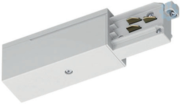 Endeinspeiser mit Polarität links, Material: Polycarbonat, kupferlegierte Kontakte, max. elektrische Belastung: Wechselstromnetz 3.6 kVA, Drehstromnetz 3 x 3.6 kVA = 10.8 kVA, Nennstrom und Nennspannung: 16 A / 440 V (1 A / 50 V AC FELV), werkzeuglose Einrastbefestigung, Schraubkontakte mit Mutter Normen: CE, ENEC, RoHS Abmessungen (LxBxH): 95 x 32 x 38 mm