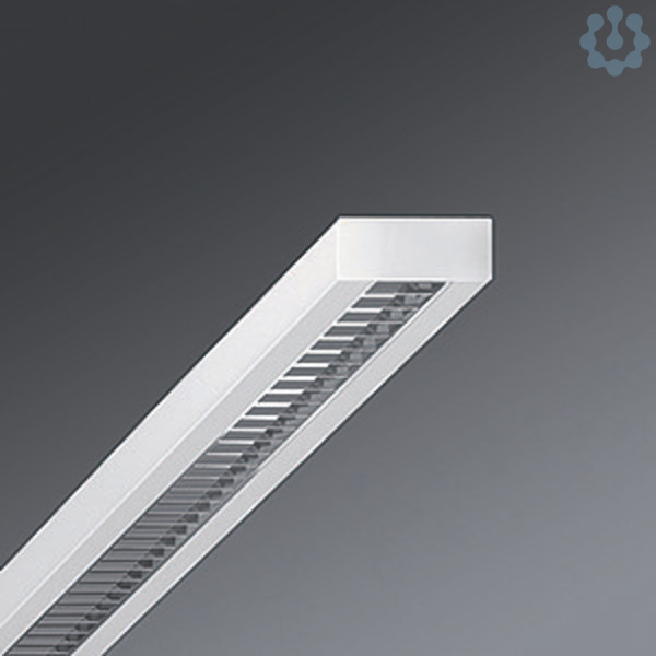Stahlblechgehäuse, kompakter rechteckiger Querschnitt, Bauhöhe 40mm, vorbereitet zum Befestigen von Stirnseiten oder Leuchtenverbindern aus Stahl, Lichtverteilung direkt strahlend mittels reflexionsverstärktem Aluminium-Parabolraster seidenmatt mit Niederquerschnitts-Lamellen, für Bildschirmarbeitsplätze, 65° < 1000 cd/qm rundumentblendet nach aktueller Norm DIN-EN 12464-1, selbstrastend, bei Lichtbandmontage Raster optisch durchlaufend, Elektrischer Anschluss über 3-polige Anschlussklemme in Steckkontakt-Technik.