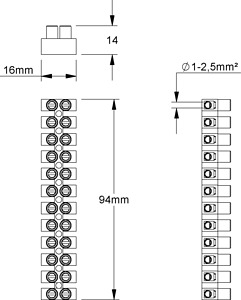 Euro-Klemme nach DIN EN 60998, mit 12 abtrennbaren Klemmstellen, mit Drahtschutz, halogenfrei. Abmessungen (ca. Maße) H x B x L : 13,5 x 16 x 94 mm Klemmbereich eindrähtig, starr, flexibel : 1,0 - 2,5 mm² Werkstoff Isolierteil : PA Werkstoff Klemmbolzen : Messing Werkstoff Klemmschrauben : galvanisch verzinkter Stahl Max. Umgebungstemperatur nach EN 60998 : T85 Nennspannung : 450 V Farbton : natur