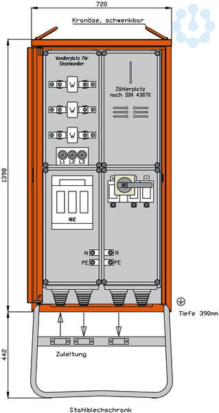 inkl. feuerverzinktem Untergestell mit Ösen für Erdnägel Einbauten im Isolierstoffgehäuse Schutzart : IP 44 Messeinrichtung Schutzart : IP 54 Größe ca.: 1398 x 720 x 390mm / H-B-T + Untergestell-Höhe ca.: 442mm
