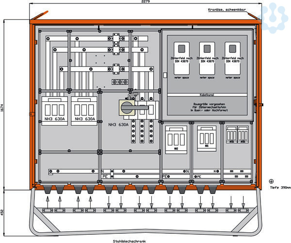 inkl. feuerverzinktem Untergestell mit Ösen für Erdnägel Einbauten im Isolierstoffgehäuse Schutzart : IP 44 Messeinrichtung Schutzart : IP 54 Größe ca.: 1674 x 2279 x 390mm / H-B-T + Untergestell-Höhe ca.: 452mm