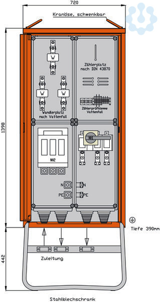 inkl. feuerverzinktem Untergestell mit Ösen für Erdnägel Einbauten im Isolierstoffgehäuse Schutzart : IP 44 Messeinrichtung Schutzart : IP 54 Größe ca.: 1398 x 720 x 390mm / H-B-T + Untergestell-Höhe ca.: 442mm