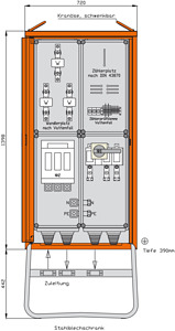 inkl. feuerverzinktem Untergestell mit Ösen für Erdnägel Einbauten im Isolierstoffgehäuse Schutzart : IP 44 Messeinrichtung Schutzart : IP 54 Größe ca.: 1398 x 720 x 390mm / H-B-T + Untergestell-Höhe ca.: 442mm