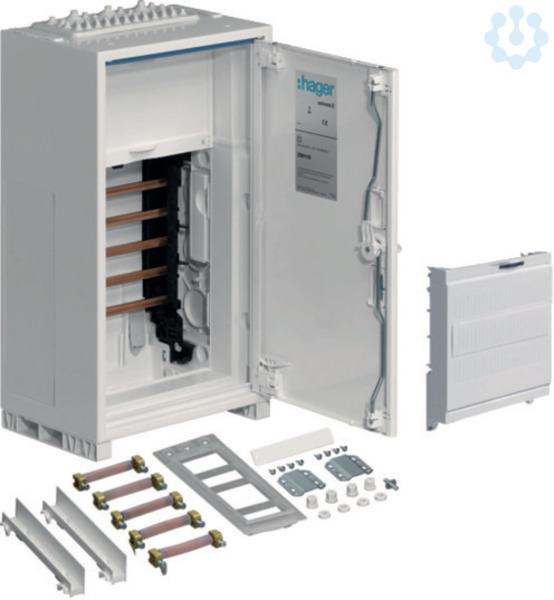 Anschlussschrank, univers Z, seitlich für SPAxxxZ, mit Verbindungsmaterial. Schrankgehäuse nach DIN VDE 0603/1, Maßnorm DIN 43870 zur Aufputz, Unterputz oder teilversenkter Montage. Zum Aufbau einer Zählerverteileranlage. Schutzart IP31 (IP44 nach DIN VDE 0470/1), Schutzklasse II schutzisoliert, Schutzart IP3X hinter der Tür. Bestehend aus Schrank mit Tür aus pulverbeschichtetem, eingebranntem, stabil profiliertem 1 mm dickem Stahlblech. Innenauskleidung komplett aus Kunststoff. Leitungseinführungen oben und unten durch eingebaute Kunststoffflanschplatten, rückseitige Vorprägung im Kunststoffteil und Sammelschienendurchführungen als beidseitige seitliche Vorprägung im unteren Bereich. Vormontierte Sammelschienen 12x5 mm bis 250 A, Bemessungsspannung 230/400 V 50 Hz, inkl. Verbindungsmaterial, für alle Netzformen nutzbar. Tür frontbündig mit innenliegenden, justierbaren Scharnieren, wahlweise rechts oder links anschlagbar mit 110° Öffnungswinkel. Türverschluß mit Vorreiber, Türverschluß durch andere Schließung