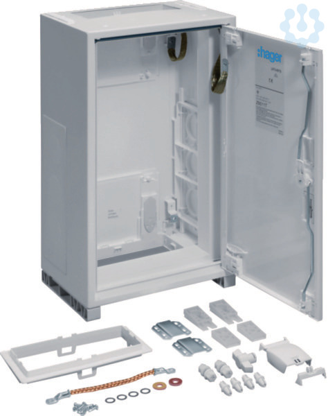 Anschlusssockel, univers, 500x1050x205mm, Schutzklasse, IP44, 144Platzeinheiten. Schrankgehäuse nach DIN VDE 0603/1, Maßnorm DIN 43 870 zur Aufputz, Unterputz oder teilversenkter Montage. Zum Aufbau einer Zählerverteileranlage bis 355 A, Bemessungsspannung 230/400 V 50 Hz. Schutzart IP31 (IP44/IP54 nach DIN VDE 0470/1), Schutzklasse II schutzisoliert, Schutzart IP3X hinter der Tür. Bestehend aus Schrank mit Tür aus pulverbeschichtetem, eingebranntem, stabil profiliertem 1 mm dickem Stahlblech. Innenauskleidung komplett aus Kunststoff. Leitungseinführungen oben und unten durch eingebaute Kunststoffflanschplatten, rückseitige Vorprägung im Kunststoffteil und Sammelschienendurchführungen als beidseitige seitliche Vorprägung im unteren Bereich. Tür frontbündig mit innenliegenden, justierbaren Scharnieren, wahlweise rechts oder links anschlagbar mit 110° Öffnungswinkel. Türverschluss mit Vorreiber, ab Breite 800 mm und bei allen Schränken ab einer Höhe von 1250 mm mit Dreipunktschließung. Türverschluss durch ander