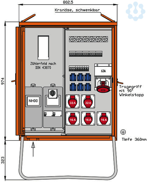 Einbauten bis einschließlich RCD-Schutzschalter im Isolierstoffgehäuse Schutzart: IP 44 Messeinrichtung Schutzart: IP 54 Größe ca.: 974 x 803 x 360mm / H-B-T
