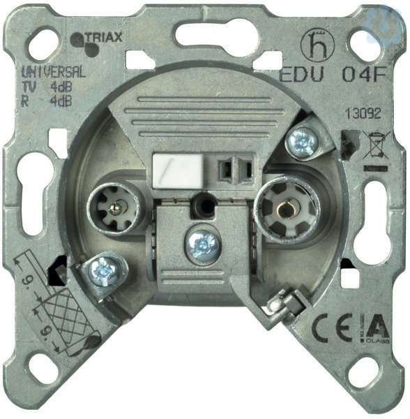 Stichleitungsdose (Einzeldose) diese Dose ist fernspeisetauglich, max. 24V- / 500mA, mit geringer Anschlussdämpfung (durchschnittlich 5 dB) (entspricht EDU 04F) Einsätze bis 2400 MHz Einsätze der Fa. Hirschmann (Bezeichnung jeweils in Klammern) Mit Buchse (RF) und Stecker (TV bzw. SAT), ohne F-Buchse. Zum Anschluss eines Tonrundfunkempfängers und eines Fernsehrundfunkempfängers oder Satelliten-Receivers. Zukunftssichere Super-Breitband-Technologie bis 2400 MHz Für Koaxialkabel mit Außenleiter bis o 5,5mm. Die Antennendosen sind geeignet für den Anschluss - einer SAT-Empfangsanlage, oder - einer terrestrischen Empfangsanlage, oder - eines BK-Anschlusses Die Antennendosen sind rückkanaltauglich für einen Frequenzbereich von 4MHz bis 30MHz. Buchse und Stecker sind nach IEC 169-2 gefertigt und erfüllen die Vorschrift DIN VDE 0855, Teil 10 und Teil 12. Die Antennendosen sind DBP-zugelassen. Durch den weit öffnenden Tragring wird das einfache, knickfreie Einlegen des Koaxialkabels ermöglicht. Grundsätzlich sollen -
