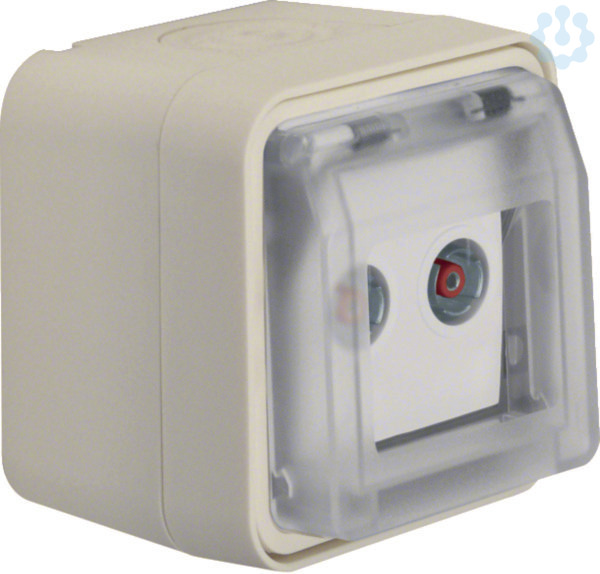 Antennen-Steckdose 2Loch Durchgangsdose AP W.1 polarweiß. Antennen-Steckdose 2-Loch mit Klappdeckel AP, Durchgangsdose, IP55. Für analoge und digitale Übertragung. Für terrestrischen Empfang, mit 2 Leitungseinführungen, mit Schraubklemmen, vollflächige Dichtung unter dem Gehäuseboden zur Abdichtung der Gehäuserückseite, mit transparentem, zufallendem Klappdeckel, manuell einrastbar, um den Schutzgrad IP55 zu erreichen, gut zugängliche, trichterförmige Montagelöcher in den Gehäusen, einfache Montage des Einsatzes im Rahmen mit Klappdeckel durch Einrasten, sichere Fixierung des Rahmens mit Klappdeckel am Gehäuse über Bajonett-Schnellverschluss.