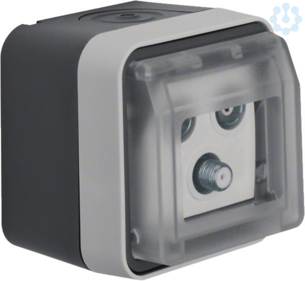 Antennen-Steckdose 3Loch Einzeldose AP W.1 grau. Antennen-Steckdose 3-Loch mit Klappdeckel AP, Einzeldose, IP55. Für analoge und digitale Übertragung. Für terrestrischen und SAT-Empfang, mit 2 Leitungseinführungen, mit Schraubklemmen, vollflächige Dichtung unter dem Gehäuseboden zur Abdichtung der Gehäuserückseite, mit transparentem, zufallendem Klappdeckel, manuell einrastbar, um den Schutzgrad IP55 zu erreichen, gut zugängliche, trichterförmige Montagelöcher in den Gehäusen, einfache Montage des Einsatzes im Rahmen mit Klappdeckel durch Einrasten, sichere Fixierung des Rahmens mit Klappdeckel am Gehäuse über Bajonett-Schnellverschluss.