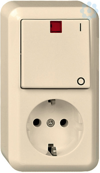 Kombination Kontroll-Ausschalter 2-polig beleuchtet und Steckdose, Farbe: reinweiß, Schalter: 10 A 250V AC, Steckdose 16 A 250V AC, Für Aufputzmontage, Schutzart IP 20, mit Grundplatte, für Montage auf brennbarem Untergrund geeignet. Steckklemmen: Klemmbereich für Kupferleiter 1,5 mm und 2,5 mm.