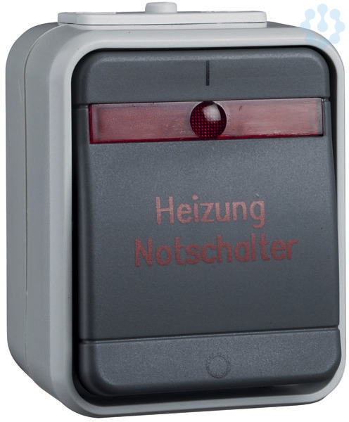 Kontroll-Ausschalter 2-polig mit rotem Aufdruck Heizung Notschalter, 10 A 250V AC. Farbe: reinweiß/basaltgrau, mit lichtintensiver Glimmlampe, für Aufputzmontage. Schutzart IP 44, mit zwei Leitungseinführungen, Steckklemmen: Klemmbereichfür Informationsleitungen ab Leitungsdurchmesser 0,5mm, für Kupferleiter 1,5 mm und 2,5 mm.