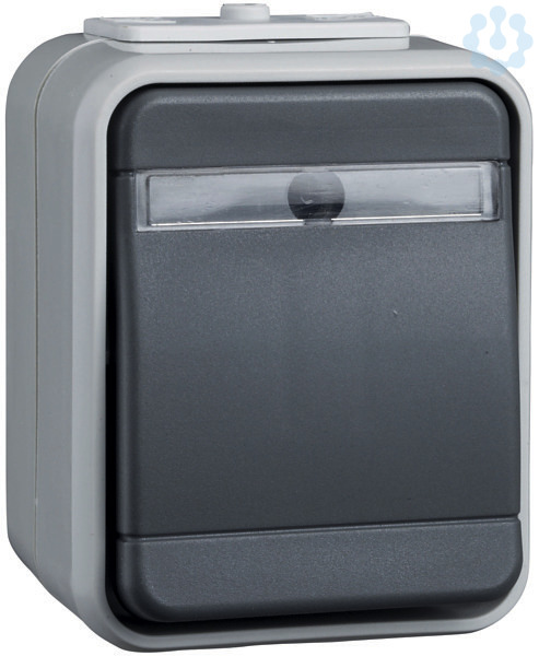 Universalschalter mit Schriftfeld, beleuchtet, 10 A 250V AC. Farbe: licht-/basaltgrau, mit beigelegten Schriftleisten, mit Symbolen Klingel, Licht, Schlüssel und neutral, für Aufputzmontage. Schutzart IP 44, mit zwei Leitungseinführungen, Steckklemmen: Klemmbereich für Informationsleitungen ab Leitungsdurchmesser 0,5mm, für Kupferleiter 1,5 mm und 2,5 mm.