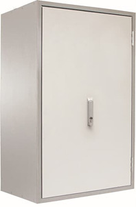 Brandschutz-Wandschrank, Baureihe AF, Leerschrank, Montageart: Aufputz, für den Innenbereich, mit Tür, Baustoff nach A2 - nicht brennbar, geprüft nach DIN 4102-1, Feuerwiderstand 30 min. geprüft nach DIN 4102-2, rauchdicht, kaltrauchdicht, Bemessungsbetriebsspannung Ue 400V AC 50/60 Hz, oberflächenbeschichtet ähnlich RAL 7035, Gehäuse aus nicht brennbarem Material, einflüglige Tür, Tür aus nicht brennbarem Material, mit Schwenkhebel mit Halbzylinder, Türöffnungswinkel 180 Grad, Türanschlag rechts, Leitungseinführung oben über Kabelschott, unten über Kabelschott, Vorbereitet für den Ausbau mit CombiLine-Modulen auf EDF-Montagegerüst