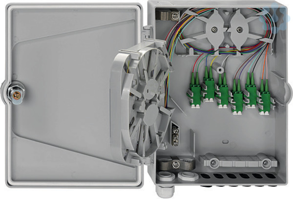 APL Hausanschlussbox, Aufputz, abschließbar, mit 4xLC-D - Kupplungen (SM/APC), - geordnete und übersichtliche Einführung von Mikrorohrsystemen, - klappbare Spleisseinheit mit Einhaltung der Biegeradien beim Klappen, - übersichtliches Faser- und Spleissmanagement in der Spleisskassette, - Spleisskassette zur Aufnahme von 24 Pigtails, - integrierter Kamm zur Aufnahme der Crimpspleisse, - spleissfertig vorbereitet mit abgesetzten und eingelegten Pigtails inkl. 2 x LC-D - Keramik-Kupplungen, grün, - 24 LC-Faserpigtails E9/125 Ám, 2 m, SM OS2 APC, Grade B1, G657.A, - mit Messprotokoll für alle Fasern incl. Seriennummer, - 12 Drop-Kabeleinführungen (?3mm) an der Gehäuseunterseite, - 2 Kabeleingänge (M20) an der Geräteunterseite, - optionaler Kabeleingang an der Gehäuseoberseite, - stabile Zugentlastungen für alle Kabeleingänge, - Endstop, 7 mm mit transparentem Locking Clip im Lieferumfang, - stabiles ABS Kunststoffgehäuse, - abschließbarer Deckel mit 2 Schlüsseln, - 1 x M20-Verschraubung im Lieferumfang, - Montage