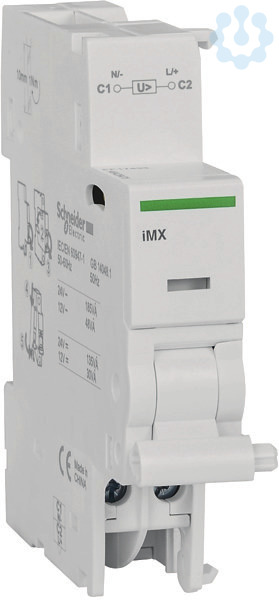 Arbeitsstromauslöser Acti 9 iMX. Betriebsspannung (Ue) 12-24V AC, 12-24V DC, Isolationsspannung (Ui) 400V. Fernauslösung eines Leitungsschutzschalters oder Fehlerstromschutzschalters, wenn eine Spannung an den Spulenkontakten angelegt wird. Wiedereinschalten erst möglich, wenn die Spannung nicht länger anliegt.