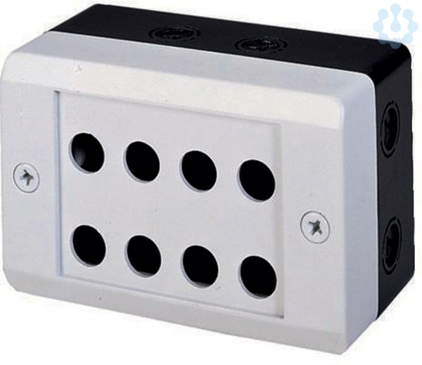 Aufbaugehäuse, Einzelgerät, für konventionelle Verdrahtung, mit Kunststoff-Deckelbefestigungsschrauben, Einbaustellen: 8, 4 (Boden), 7 (Seite) Anzahl x M20, Schutzart: IP65, Farbe: Gehäuseunterteil RAL 9005, schwarz, Anbindung an SmartWire-DT: nein
