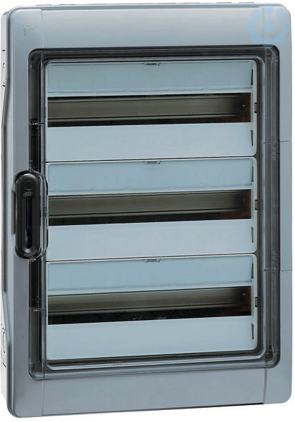 Legrand Feuchtraumverteiler Plexo³, Schutzart IP65 - IK09, 3-reihig, 36 Module (12 Module/Reihe), Abmessung 622 x 340 x 161 (Höhe x Breite x Tiefe in mm), selbstverlöschend 650 °C, inklusive N- und PE-Klemmen, Aufputzverteiler Schutzklasse II. Türen transparent, beidseitig anschlagbar. Nach EN 62208, für den Bau von Installationsverteilern nach EN 61439-3.