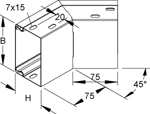 Industriekanal Außeneck 45°, mit aufrastbarem Deckel, Kanalunterteil ungelocht jedoch mit Schraubverbinderlochung in den Seiten, der Potentialausgleich der Deckel erfolgt automatisch beim Aufrasten, Zubehör für den Potentialausgleich, zwei Stoßstellenverbinder LIV 60 je Stoßstelle, muss gesondert bestellt werden. VDE zertifiziert! für Industriekanäle : LUE... LI... Abmessungen (ca. Maße) H x B (ca. Maße) : 60 x 150 mm Schenkellänge innen : 75 mm Werkstoff : Stahl, bandverzinkt nach DIN EN 10346