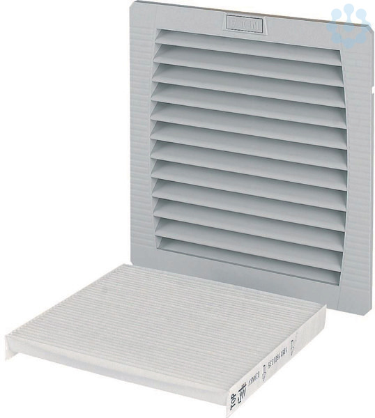 Austrittsfilter werden zur Ergänzung von Filterlüftern eingesetzt, selbes Design wie Filterlüfter, einfache Installation, einfacher Wechsel der Filtermatten, aus thermoplastischem Kunststoff, Schutzart IP55, selbstlöschender Kunststoff UL 94 VO, RAL 7035 Ausschnitt [HxB] 177mm x 177mm, Maße 202mm x 202mm, UV-beständiger Kunststoff