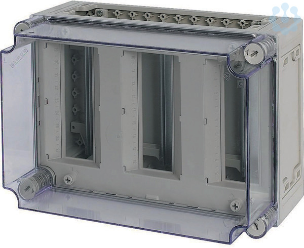 Automaten-Verteilergehäuse, patentierter Deckelverschluss mit integriertem Überdruckausgleich, Material Polycarbonat, schlagfest, Schutzart IP65, Seitenwände geschlossen, ausschlagbar, Wände oben und unten offen, Einbaugeräte Baugröße 1 nach DIN 43880, Deckel dursichtig mit Griffverschlüssen, Tragschienen zum Aufschnappen der Geräte, Verschlussstreifen für unbenutzte Einbauplätze, Berührungsschutzabdeckung mit Beschriftungsstreifen,