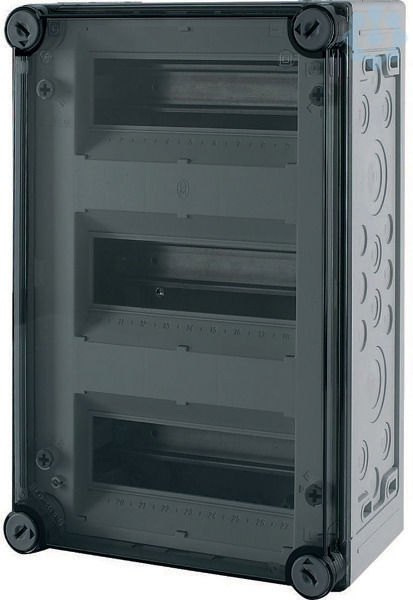 Automaten-Einzelgehäuse, Material Polycarbonat, schlagfest, Schutzart IP65, metrische Vorprägungen in allen Seitenwänden, Einbaugeräte Baugröße 1 nach DIN 43880, Deckel dursichtig mit Griffverschlüssen, Tür durchsichtig rauchgrau zum Bedienen der Einbaugeräte, Tragschienen zum Aufschnappen der Geräte, Verschlussstreifen für unbenutzte Einbauplätze, Berührungsschutzabdeckung mit Beschriftungsstreifen, PE/N-Schienen inklusive, Befestigungslaschen für Wandbefestigung, plombierbare Deckelverschlüsse, Anzahl TE=27, PE- und N-Klemmen AnzahlxQuerschnitt=je 4x(6-35)qmm und 20x(1-4)qmm, Ausführung Deckel: durchsichtig rauchgrau, Ausführung Tür: ohne