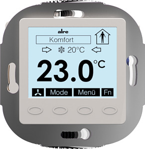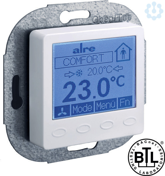 Der alre BACnet Einzelraumregler mit grafischem Display wurde speziell für den zeitabhängigen Heiz- und Kühlbetrieb in 2- oder 4-Rohr-Systemen entwickelt. Der Regler kann in vielfältigen Bereichen eingesetzt und angewendet werden, wie zum Beispiel im Hotel, Wohn-, Büro- und Geschäftsräumen sowie Krankenhäuser und Schulen. Das Gerät besitzt zwei Ein- und drei Ausgänge. Zwei der Ausgänge schalten Relais, die jeweils bis zu 5 Stellantriebe ansprechen können. Der dritte Ausgang ist analog ausgeführt (0-10 V) und kann z. B. für die EC-Lüftersteuerung verwendet werden. Einer der beiden Eingänge dient zur BACnet-Kommunikation, der andere ist konfigurierbar für den Anschluss von Sensoren z. B. für Temperatur oder Taupunkt. Über BACnet können Fenster oder Präsenzkontakte verbunden werden.